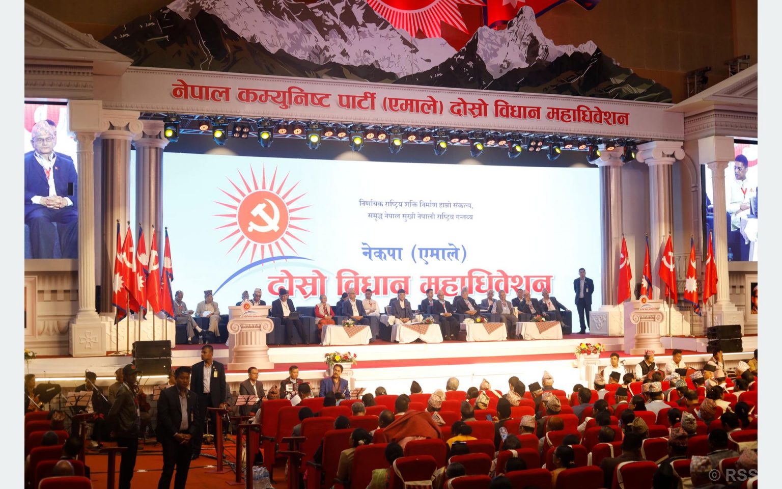 ललितपुर : नेपाल कम्युनिष्ट पार्टी (एमाले) को दोस्रो विधान महाधिवेशन ललितपुरको सनराइज सभा हलमा सुरु भएको छ । ‘निर्णायक राष्ट्रिय शक्ति निर्माण हाम्रो सङ्कल्प, समृद्ध नेपाल सुखी नेपाली राष्ट्रिय गन्तव्य’ भन्ने मूल नारासहित महाधिवेशन सुरु भएको हो ।