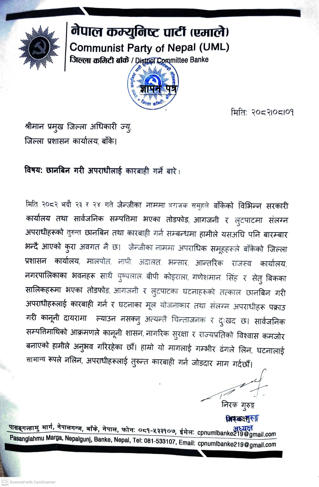 एमाले बाँकेका अध्यक्ष निरक गुरुङद्वारा हस्ताक्षरित पत्रमा जेनजी नामका समूहले जिल्ला प्रशासन कार्यालय, मालपोत, नापी, अदालत, भन्सार, आन्तरिक राजस्व, वडा कार्यालयदेखि सडकमै रहेका शालिकसमेत तोडफोड गरेर ‘अराजक गतिविधि’ फैलाएको कुरा उल्लेख छ ।