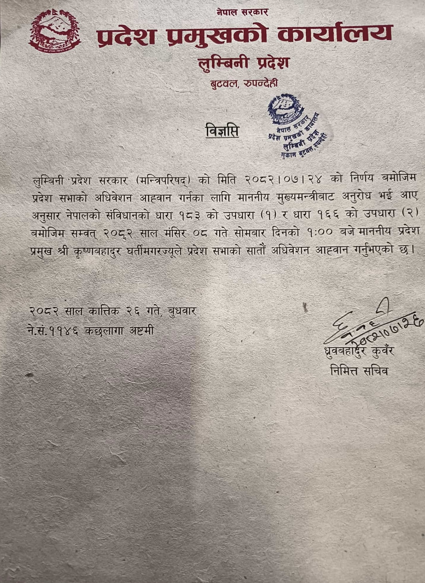 नेपालको संविधानको धारा १८३ को उपधारा (१) र धारा १६६ को उपधारा (२) बमोजिम मंसिर ८ गते सोमवार दिउँसो १ बजेबाट अधिवेशन सुरु हुनेगरी प्रदेश प्रमुख घर्तीले आह्वान गरेको प्रदेश प्रमुखको कार्यालयका निमित्त सचिव धु्रवकुमार कुवँरले जानकारी दिए ।