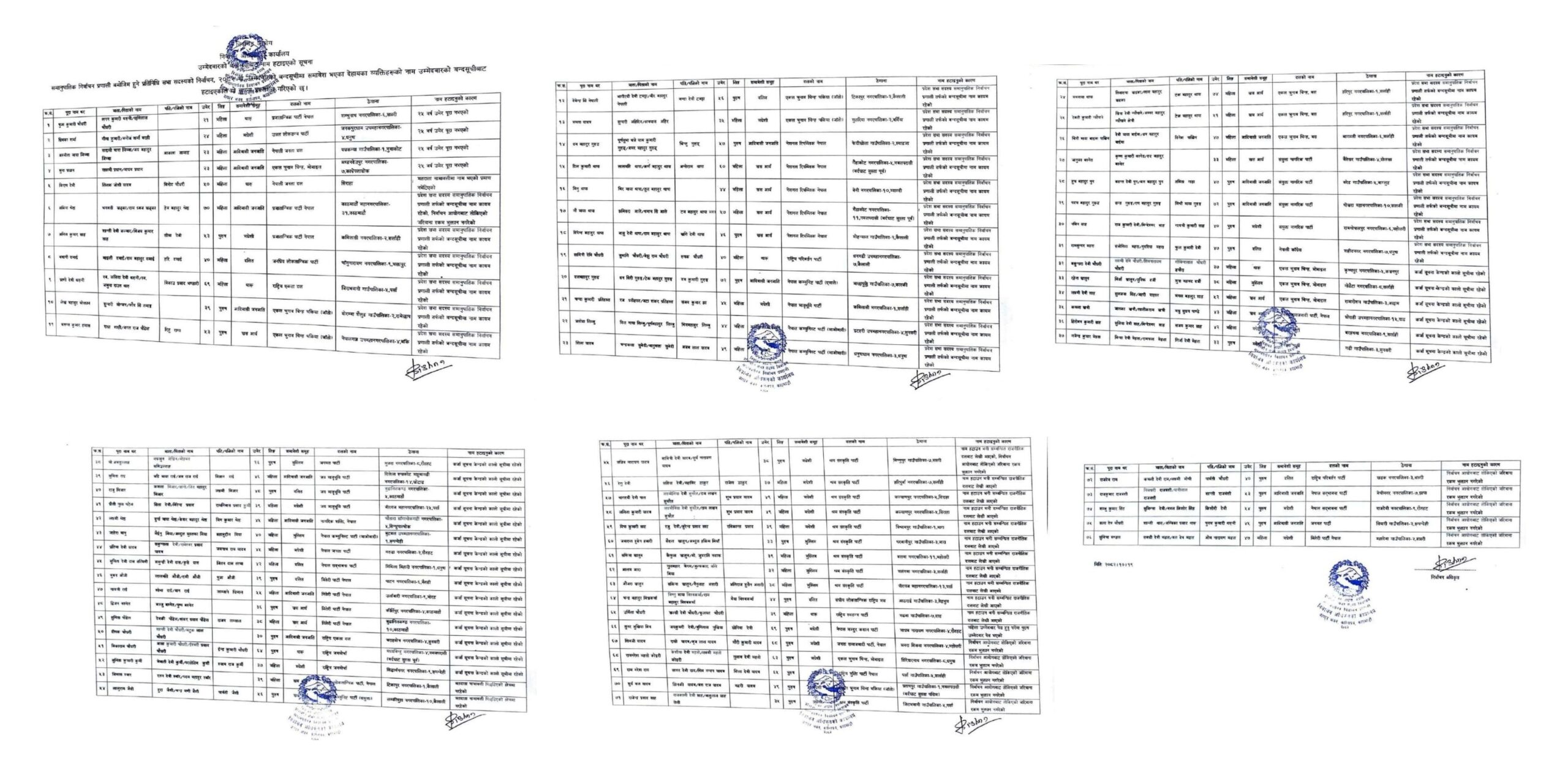 जस अनुसार, कर्जा सूचना केन्द्रको कालो सूचीमा रहेका २१ जनाको नाम हटाइएको छ । प्रदेश सभाको बन्दसूचीतर्फ नाम कायम भएका २५ जना, आयोगको जरिवाना भुक्तान नगरेका १०, २५ वर्ष उमेर नपुगेका ४, मतदाता नामावलीमा समावेश नभएका १, मतदाता नामावली पिछडिएको क्षेत्रमा नरहेका २, महिलाको ठाउँमा पुरुष उम्मेदवारको रुपमा पेश भएका १, राजनीतिक दलबाट नाम हटाउन अनुरोध भएका १० र अन्य कारणबाट २ जनाको नाम हटाइएको हो ।