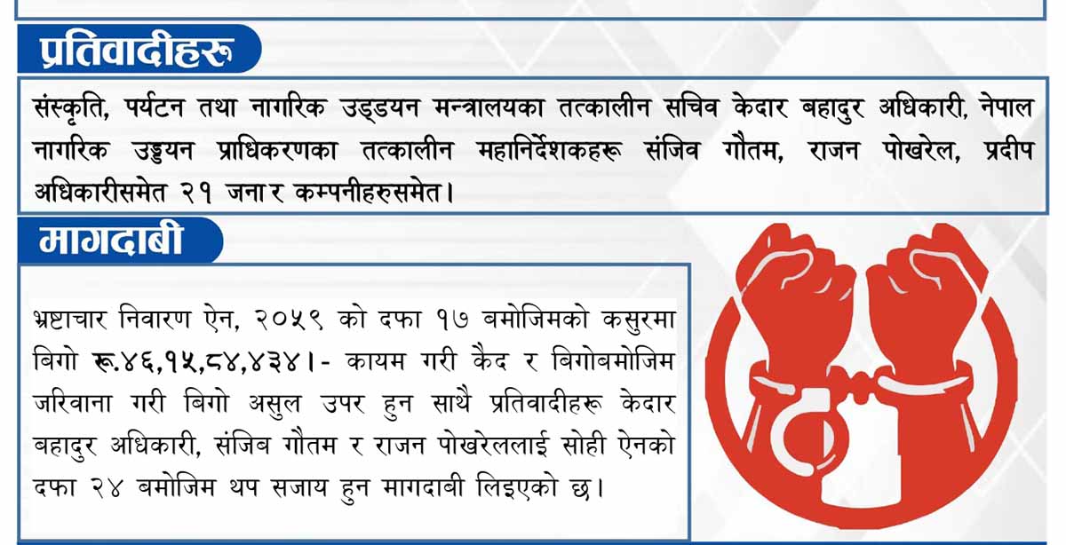 आयोगले संस्कृति, पर्यटन तथा नागरिक उड्डयन मन्त्रालयका तत्कालीन सचिव केदारबहादुर अधिकारी, नागरिक उड्डयन प्राधिकरणका तत्कालीन महानिर्देशक संजिव गौतम, राजन पोखरेल र प्रदीप अधिकारीसहितलाई प्रतिवादी बनाएको छ ।