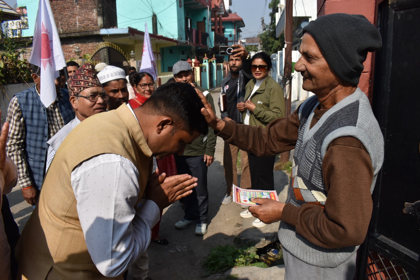 एमाले उम्मेदवार राई चुनावी अभियानका क्रममा मतदाताको घरदैलोमै व्यस्त